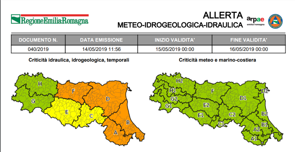 La Protezione Civile ha emesso un’allerta valida dalle ore 00:00 di Martedì 15 Maggio alle ore 00:00 di Mercoledì 16 Maggio per piene dei fiumi, frane e piene dei corsi minori.