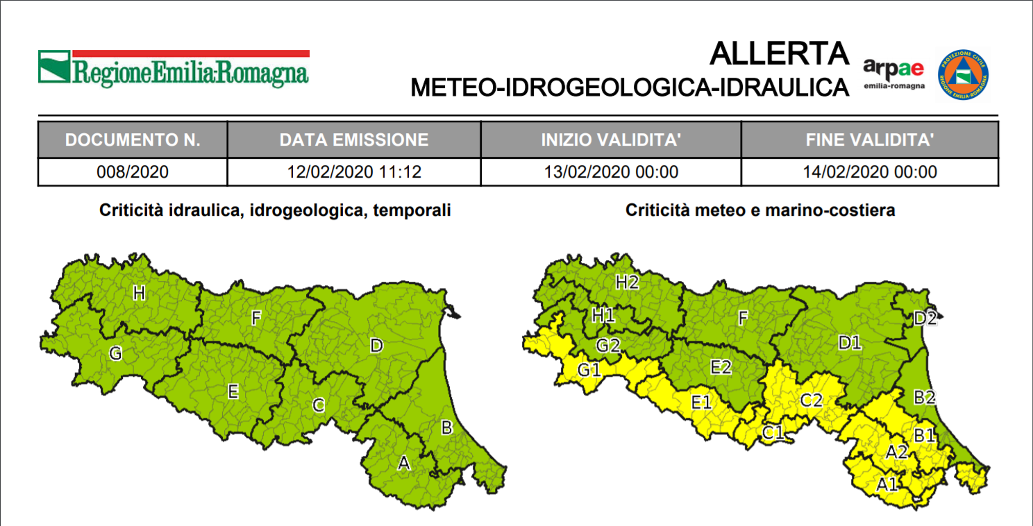 Zone interessate dall’allerta: A1 – Montagna Romagnola (FC-RN); A2 – Collina Romagnola (RA-FC-RN); B1 – Pianura Romagnola (RA-FC-RN); C1 – Montagna Emiliana Orientale (BO); C2 – Collina Emiliana Orientale (BO-RA); E1 – Montagna Emiliana Centrale (MO- RE -PR); G1 – Montagna Emiliana Occidentale (PC-PR);
