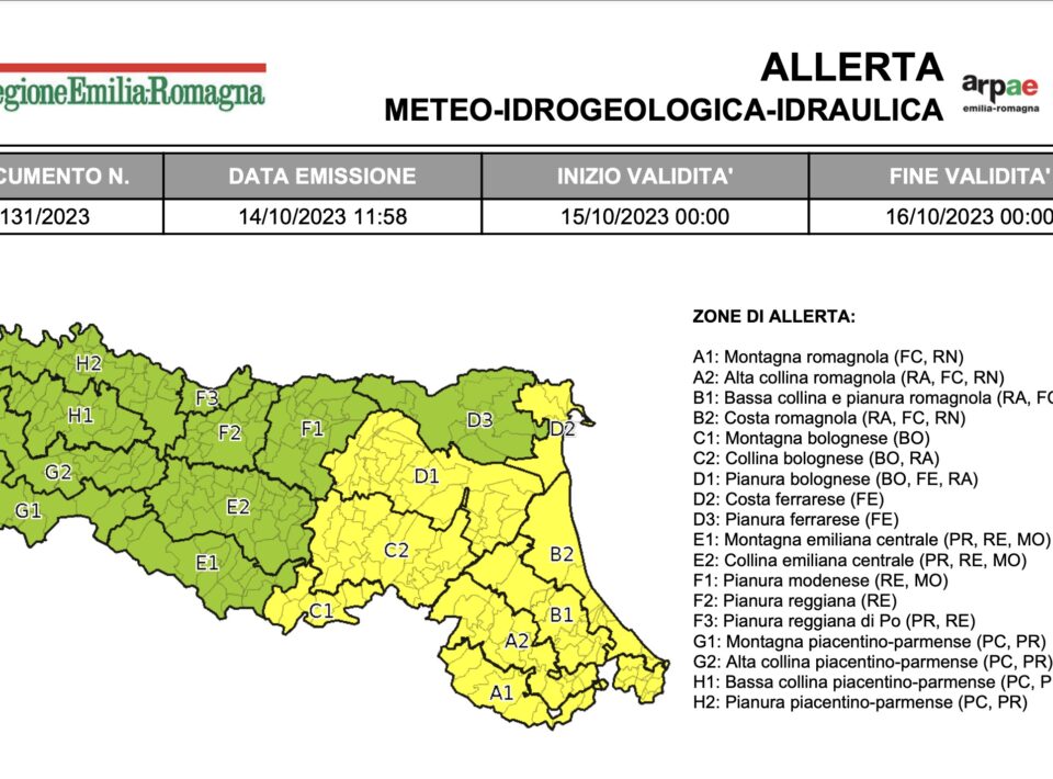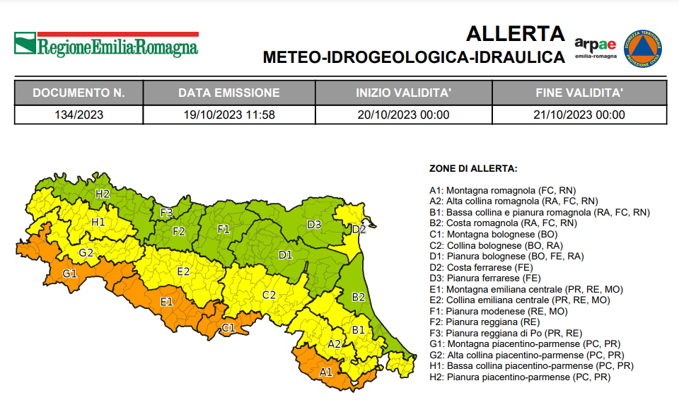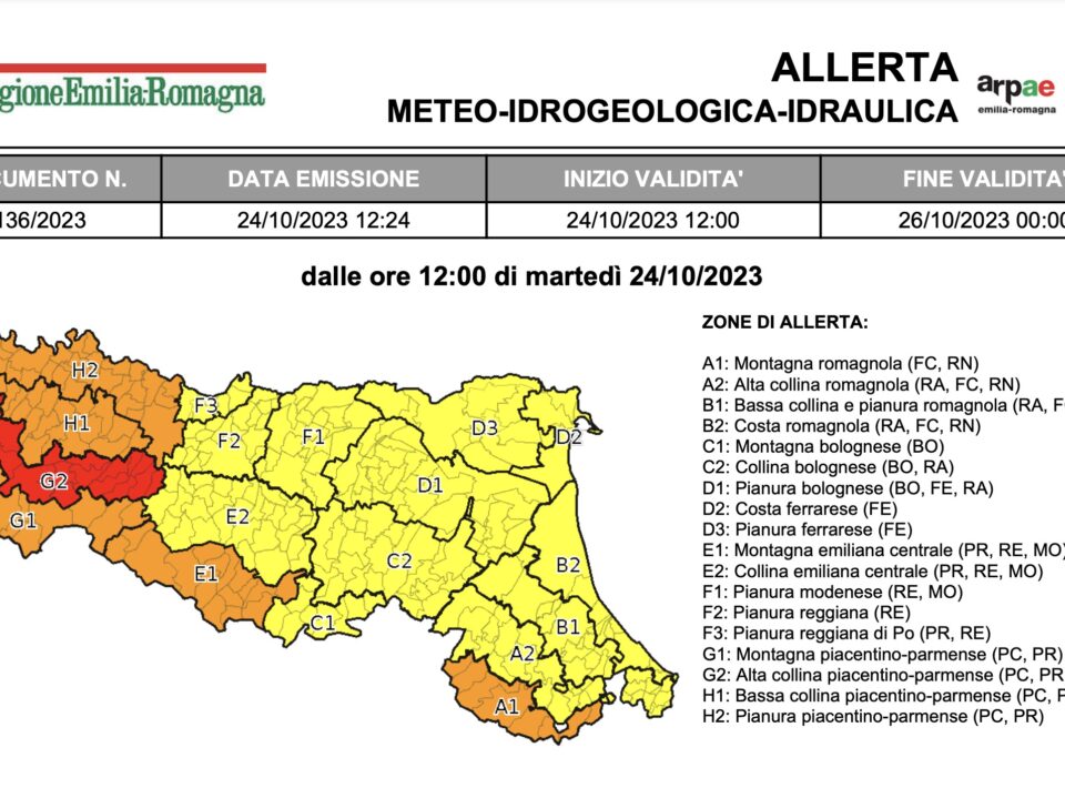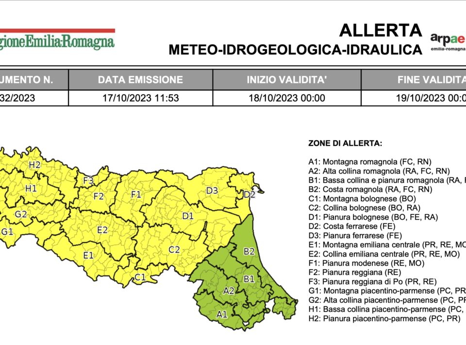 Per venerdì 20 ottobre è stata emessa l’allerta meteo n.134/2023 valida sul territorio regionale dell’Emilia-Romagna per temporali, vento, frane, piene...