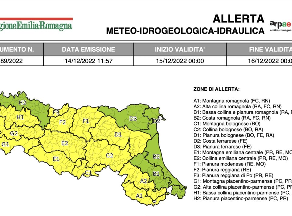 14 Dicembre 2022 Giovedì 15 dicembre allerta per piene dei fiumi, frane e gelicidio Per la giornata di giovedì 15 dicembre è stata emessa l’allerta meteo n.089/2022 valida sul territorio dell’Emilia-Romagna per piene dei...