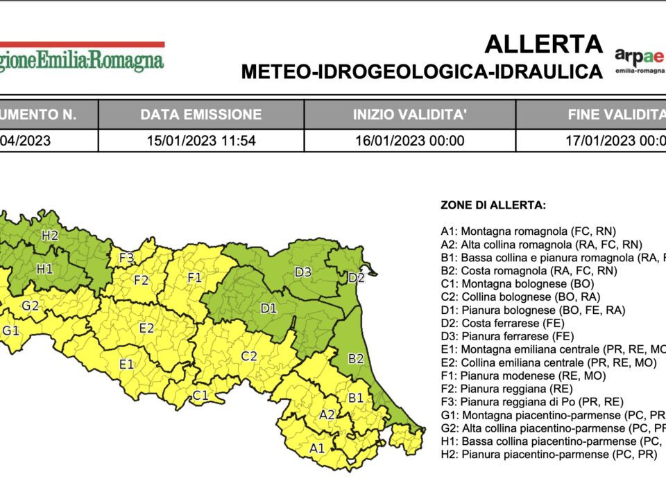 15 Gennaio 2023 Lunedi’ 16 gennaio allerta per piene dei corsi d’acqua e vento Per la giornata di lunedi’ 16 gennaio e’ stata emessa l’allerta n.004/2023 valida sul territorio dell’Emilia-Romagna per piene dei corsi...
