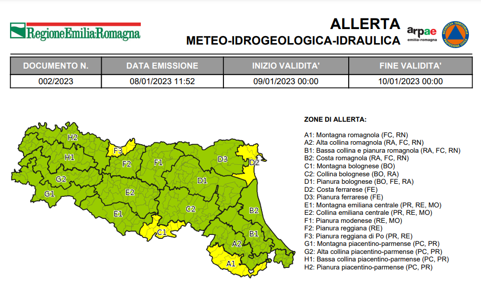 09 Gennaio 2023 Lunedì 9 gennaio allerta meteo per vento e piene dei fiumi Per la giornata di lunedì 9 gennaio è stata emessa l’allerta n.002/2023 valida sul territorio dell’Emilia-Romagna per vento e piene...