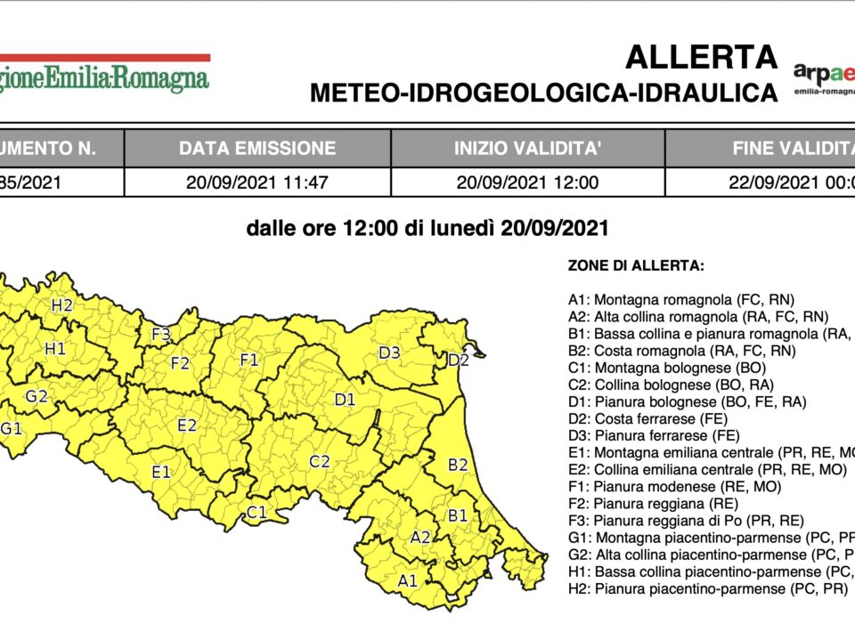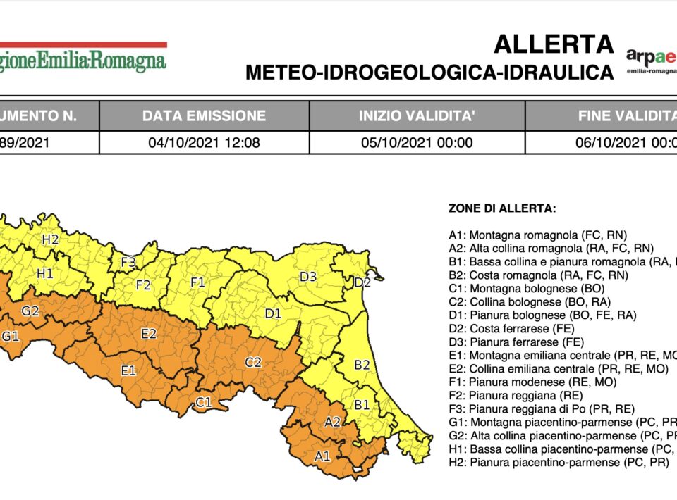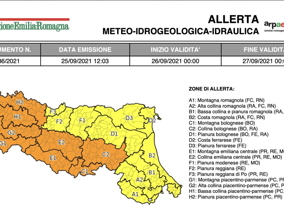 16 Settembre 2021 Allerta meteo per temporali, frane e piene dei corsi minori, vento per le prossime 36h Per la giornata di giovedì 16 settembre è stata emessa l’allerta 084\2021 valida sul territorio dell’Emilia-Romagna per temporali, frane e...