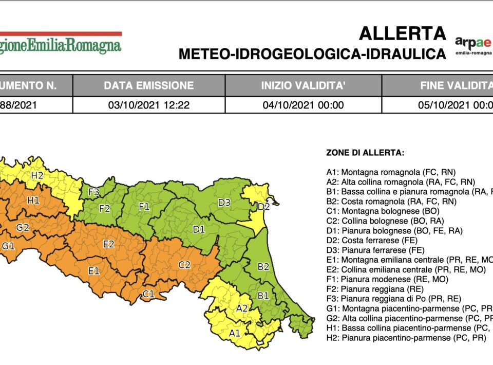 03 Ottobre 2021 Allerta meteo per temporali, vento, piene, frane e mareggiate lunedì 4 ottobre Per la giornata di lunedì 4 ottobre è stata emessa l’allerta n.088\2021 valida sul territorio regionale dell’Emilia-Romagna per temporali, vento,...