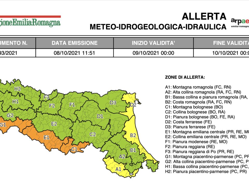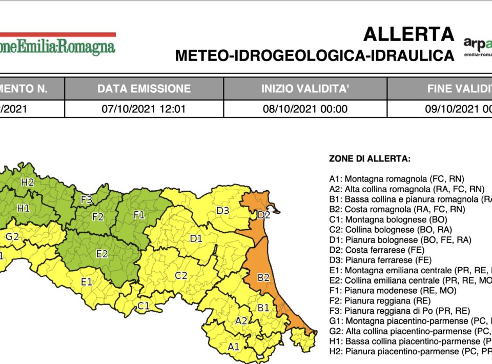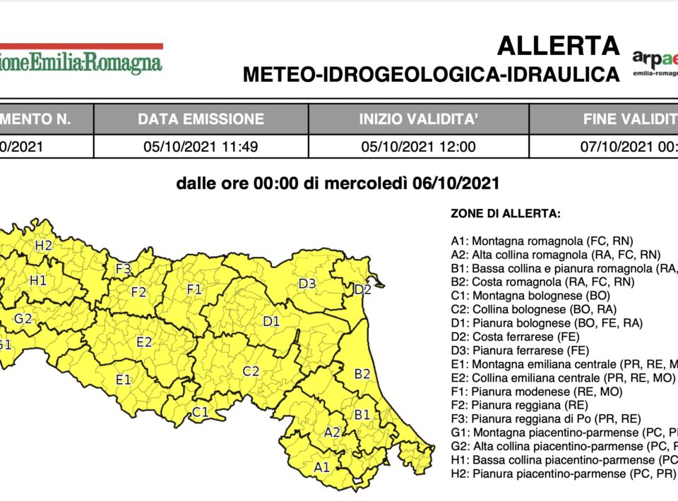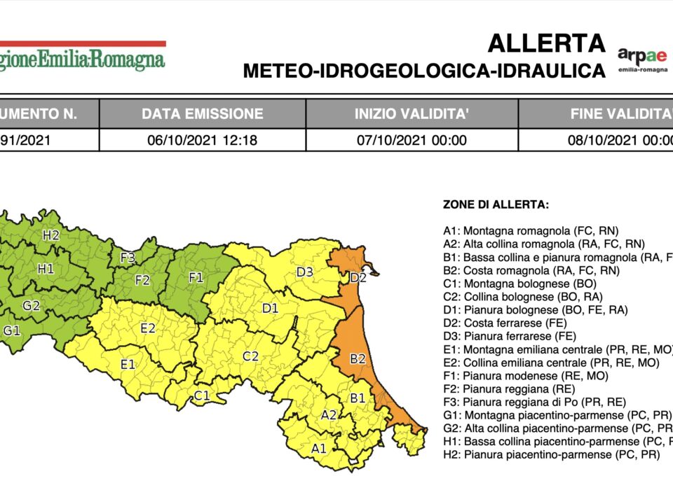06 Ottobre 2021 Allerta per giovedì 7 ottobre: vento, piene, frane, temporali, stato del mare e mareggiate Per la giornata di giovedì 7 ottobre è stata emessa l’allerta meteo n.091\2021 valida sul territorio dell’Emilia-Romagna per vento, piene dei...