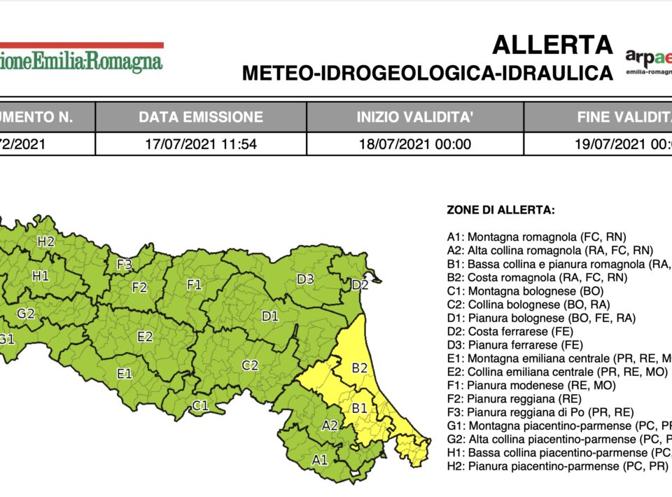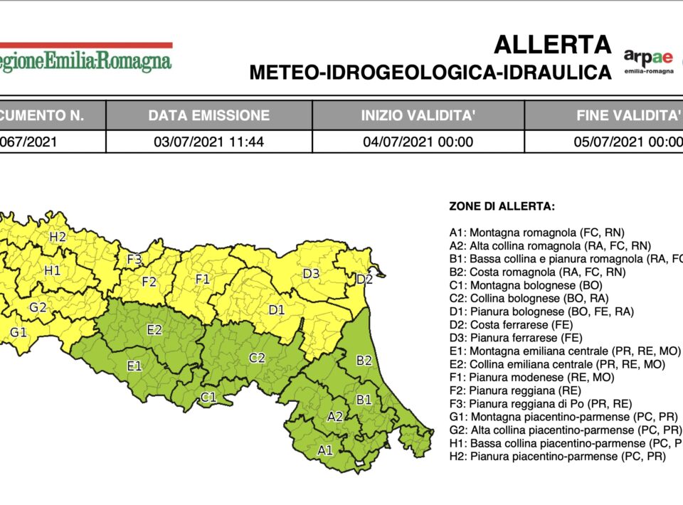 03 Luglio 2021 Allerta meteo per domenica 4 luglio: temporali Per la giornata di domenica 4 luglio è stata emessa l’allerta meteo n.067\2021 valida sul territorio dell’Emilia-Romagna per temporali. ella...