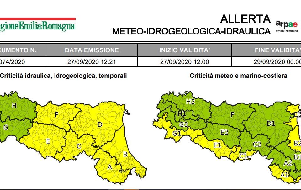27 Settembre 2020 Allerta della Protezione Civile: temporali, frane, piene dei fiumi, vento e stato del mare La Protezione Civile ha emesso un’allerta meteo valida dalle ore 12:00 di Domenica 27 Settembre alle ore 00:00 di Martedì...