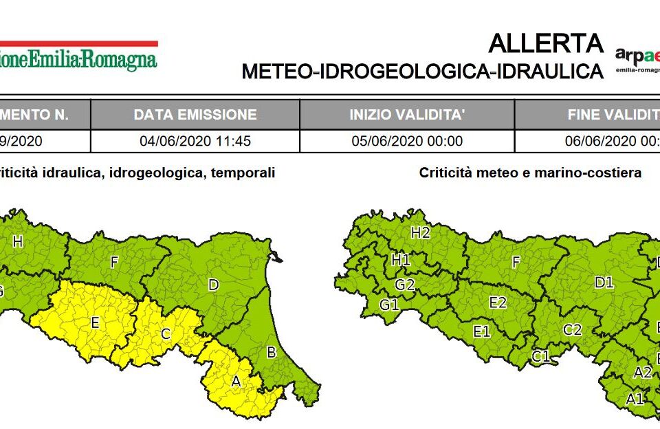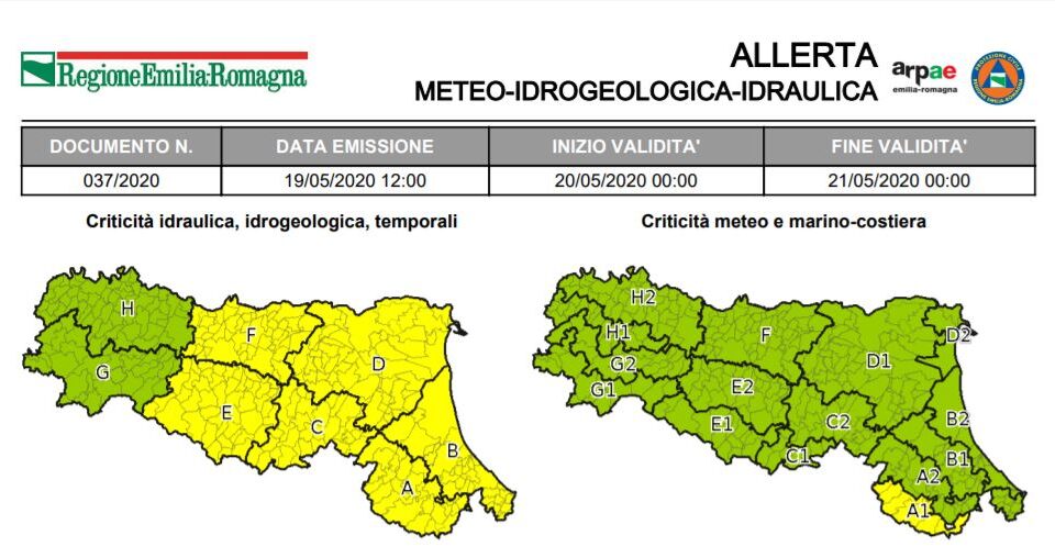 19 Maggio 2020 Allerta della Protezione Civile: temporali, piene dei fiumi, vento Allerta della Protezione Civile valida dalle ore 12:00 di oggi, Martedì 19 Maggio alle ore 00:00 di Giovedì 21 Maggio...