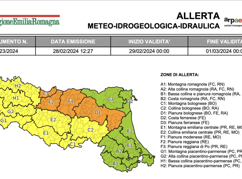 28 Febbraio 2024 Giovedì 29 febbraio allerta per piene dei corsi d’acqua e frane Per la giornata di giovedì 29 febbraio è stata emessa l’allerta meteo 025/2024 valida sul territorio dell’Emilia-Romagna per piene dei...