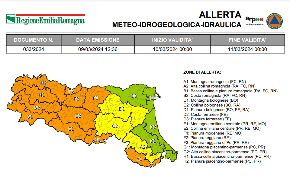 09 Marzo 2024 Domenica 10 marzo allerta per temporali, neve, vento, piene e frane Per domenica 10 marzo è stata emessa l’allerta meteo n.033/2024 valida sul territorio regionale dell’Emilia-Romagna per piene dei fiumi, frane...