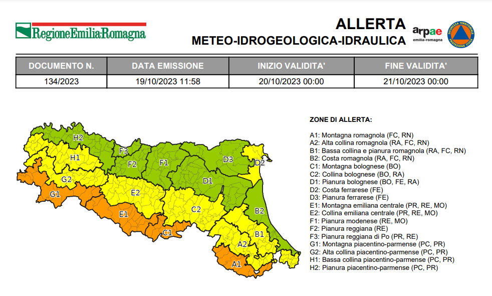 Per venerdì 20 ottobre è stata emessa l’allerta meteo n.134/2023 valida sul territorio regionale dell’Emilia-Romagna per temporali, vento, frane, piene e altre criticità.