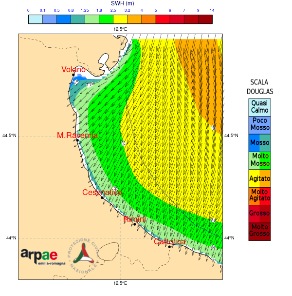 Come si evince dalla mappa del modello Swan di Arpae, l’altezza d’onda massima verrà raggiunta fra sera e primissima nottata: