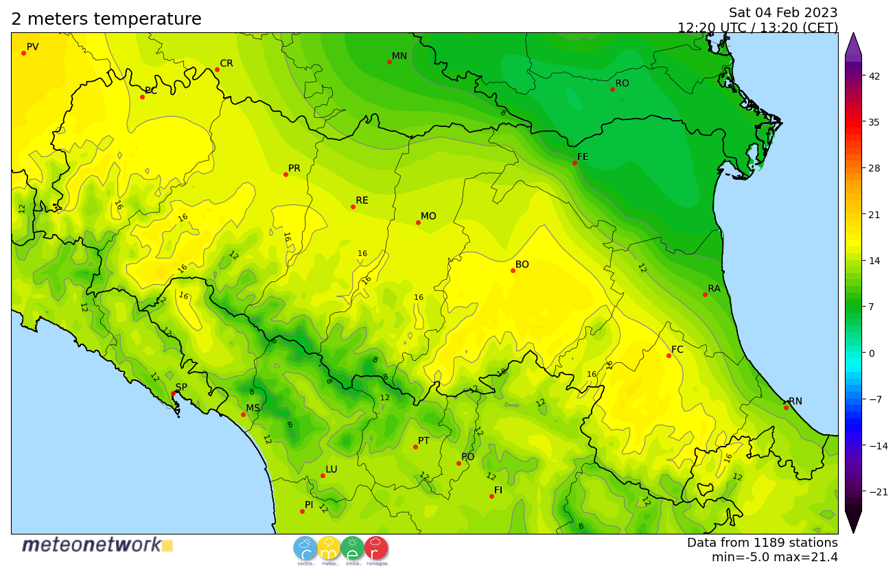 E’ un Sabato 4 Febbraio decisamente mite, anche a causa di venti di Favonio che portano le temperature su valori diffusamente superiori ai 16 gradi sulle aree pianeggianti e collinari dell’Emilia-Romagna.