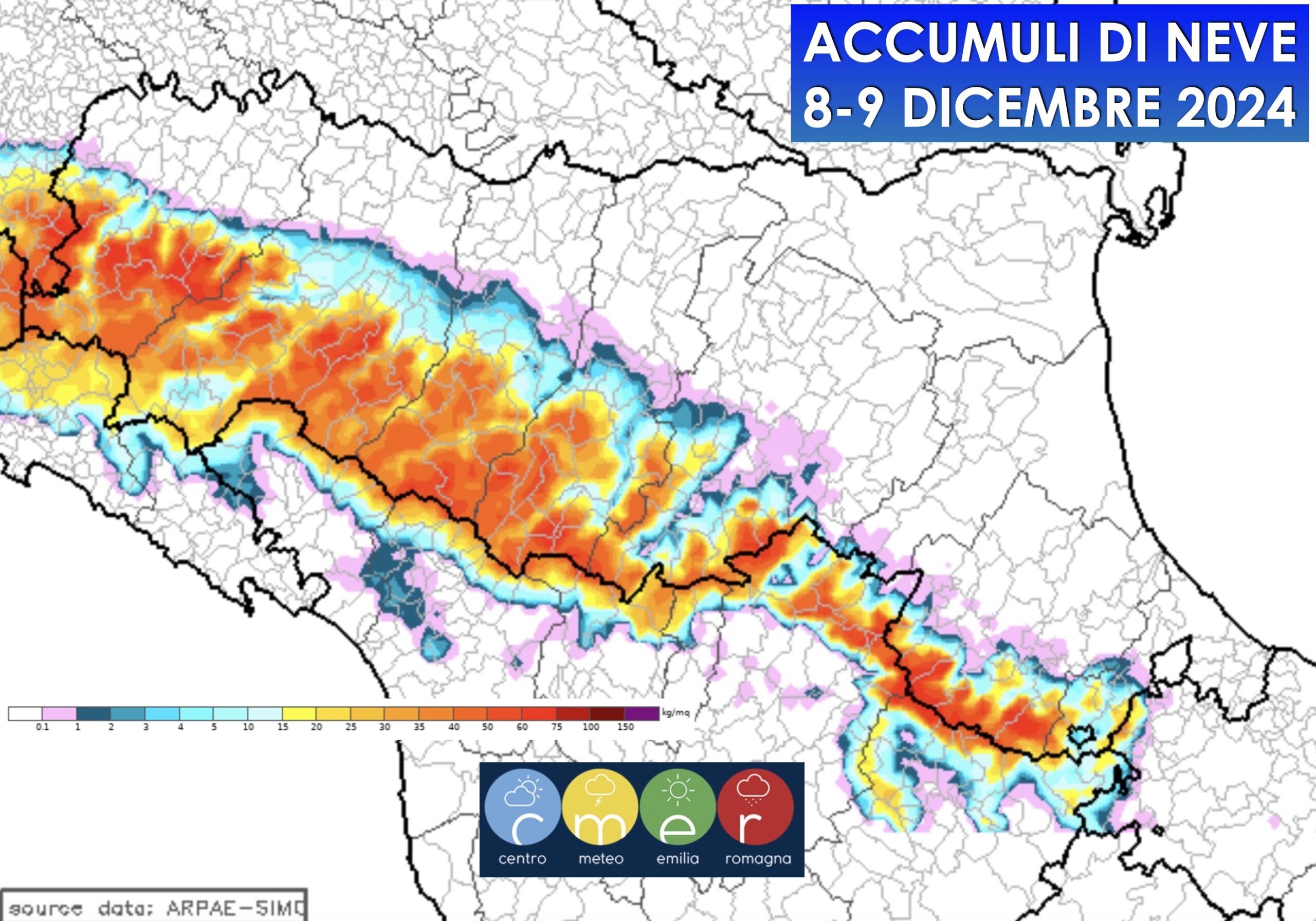In Romagna, oltre 800-1000 metri di quota, possibili valori oltre 30 cm e localmente fino a 50 cm in particolare tra la serata di domenica e la giornata di lunedì quando il territorio sarà interessato dai fenomeni più intensi.