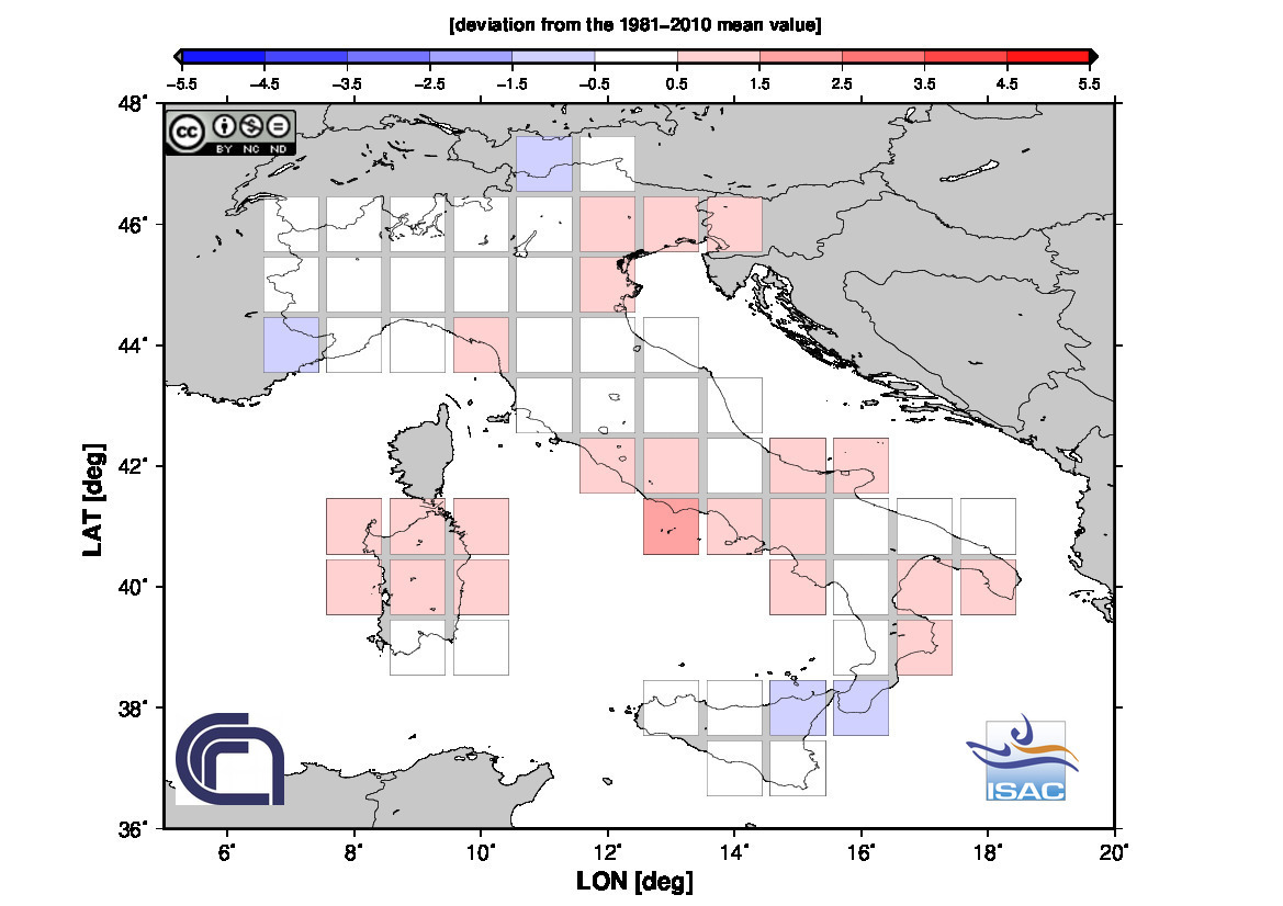 Nello specifico delle temperature minime si è registrata un’anomala di +0,48 °C , mentre sono state più contenute le massime con un’anomalia di +0,27 °C.