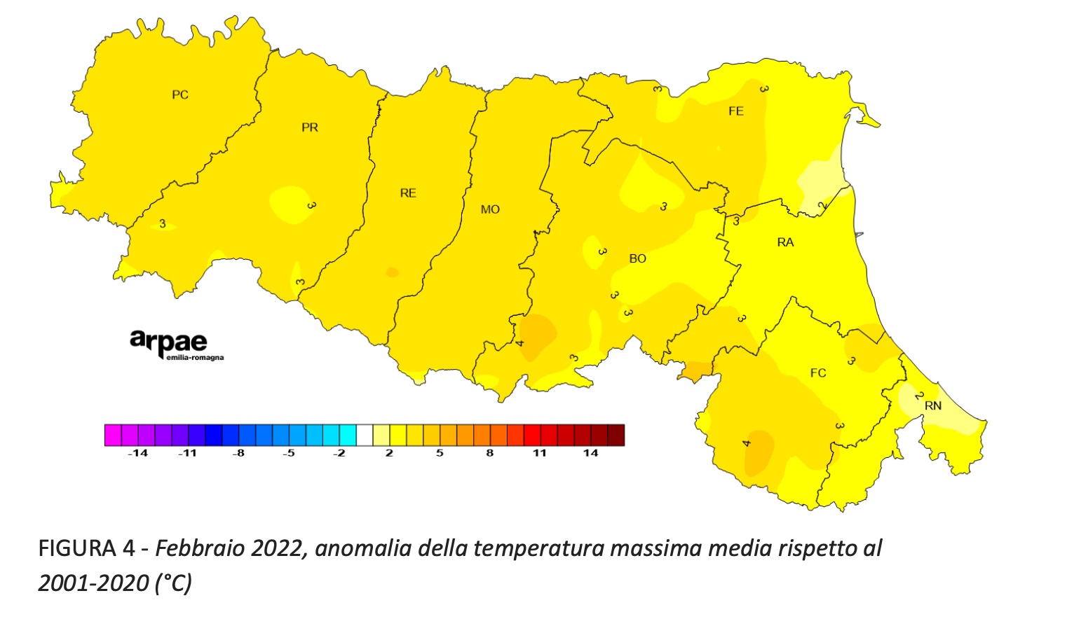 Considerando la media delle temperature massime giornaliere, febbraio 2022 è il quarto mese più caldo degli ultimi 30 anni dopo il 2020, il 1998 e il 2019.