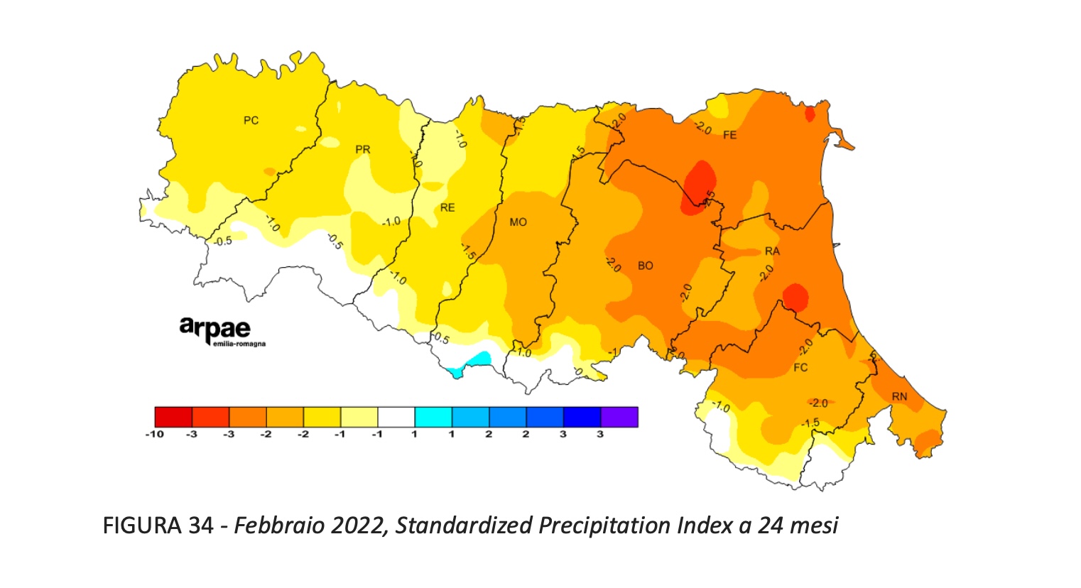 Le precipitazioni di autunno 2021 e inverno 2021-22 sono risultate molto inferiori alle attese; il valore cumulato dal 1 ottobre 2021 al 28 febbraio 2022, 307 mm di media regionale, è il più basso degli ultimi 10 anni. Valori inferiori sono stati registrati nelle annate 2011-2012, 2006-2007 e 2001-2002.