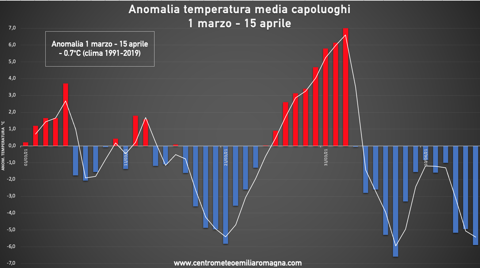 - Grafico delle anomalie di temperatura dal 1 marzo al 15 aprile: accentuati sbalzi termici con prevalenza di fasi fredde