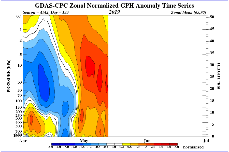 Concludiamo l’articolo con questo ultimo grafico che mostra le anomalie di geopotenziale dalla bassa troposfera fino alla stratosfera sulla sezione verticale del Polo Nord. Si notano molto bene le forti anomalie iniziate tra fine aprile ed inizio maggio in stratosfera e propagatesi su tutta la sezione verticale fino alla troposfera durante tutto il mese di maggio.