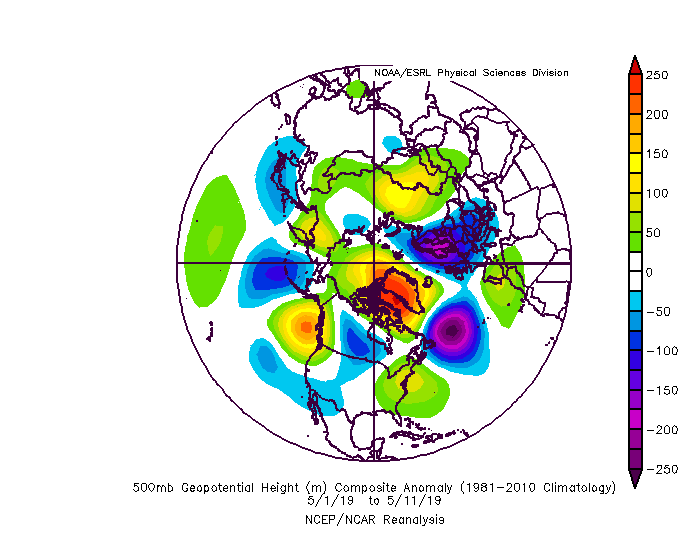 - Anomalie di geopotenziale 500 hPa 1-11 Maggio (Emisfero Nord)