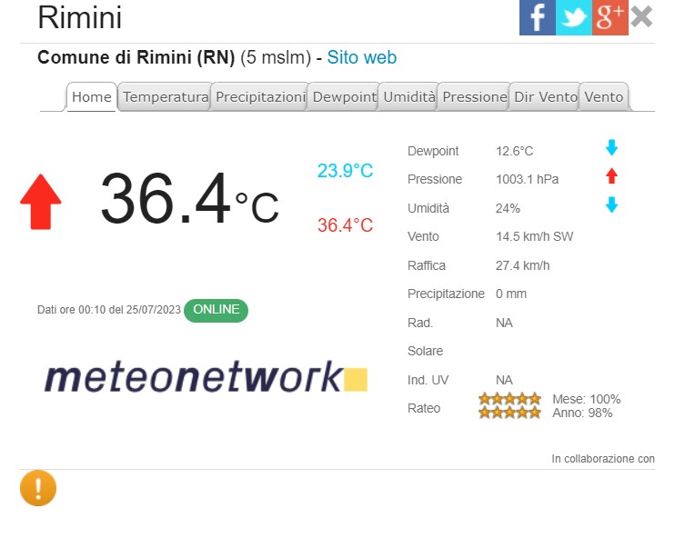 - Intorno alle ore 21:40 di lunedì 24 luglio la temperatura a Rimini città era di +29,1°C, con tassi di umidità molto elevati e caldo afoso.