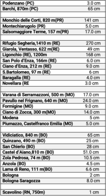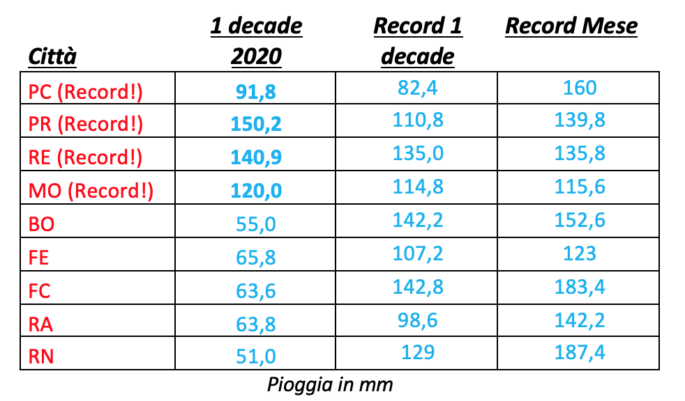 Dalla tabella si evidenziano quantitativi di pioggia abbondanti proprio sull’Emilia occidentale fino in pianura. Le città di Piacenza, Parma, Reggio Emilia e Modena hanno fatto segnare un nuovo record per la piovosità della prima decade di dicembre almeno dal 1961 e addirittura per l’intero mese a Parma, Reggio Emilia e Modena. Decisamente meno piovosi i capoluoghi orientali con i record storici che rimangono ben lontani.