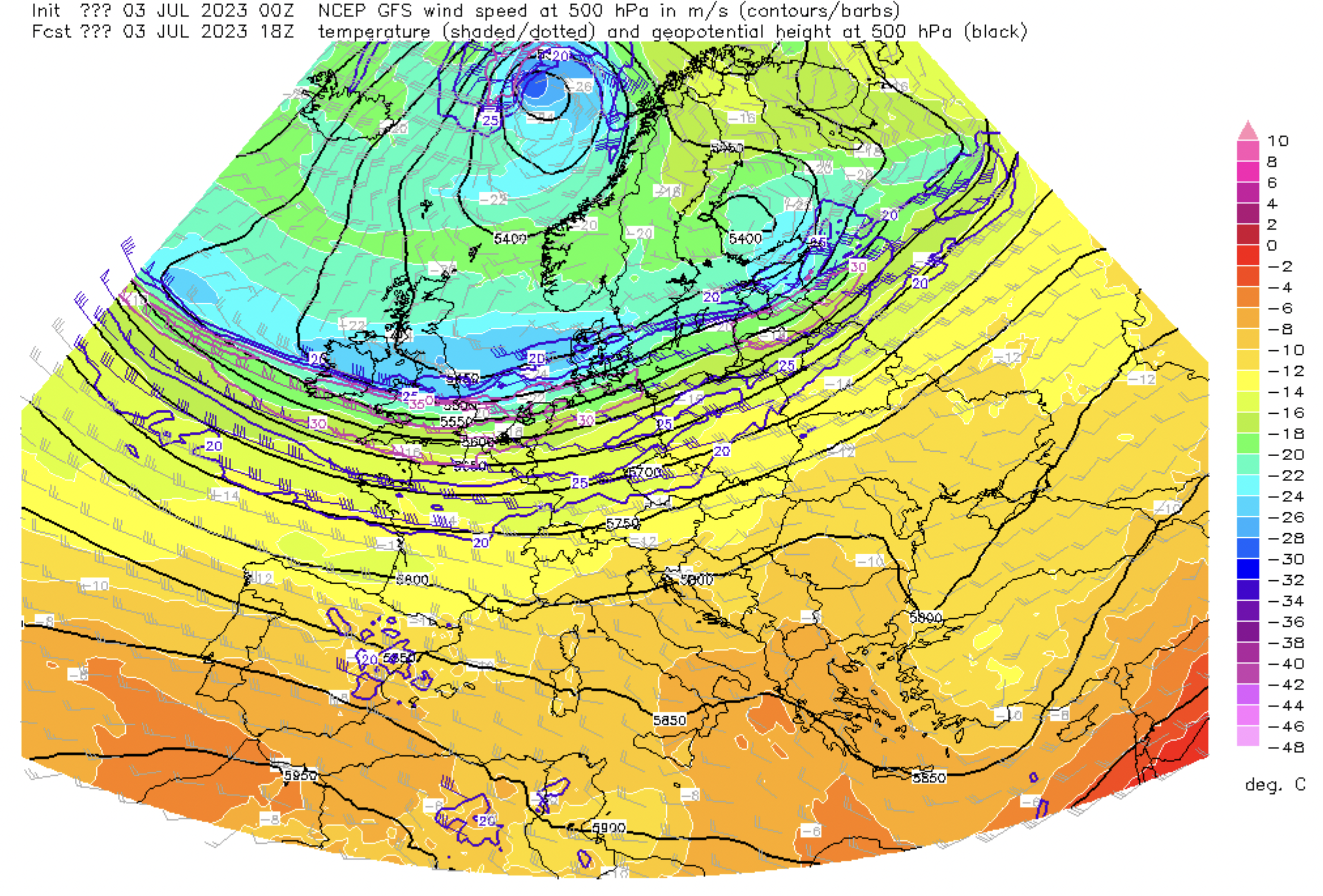 - Situazione sinottica alle ore 18:00 di ieri, Lunedì 3 Luglio: evidenti le ondulazioni Atlantiche alla base di questo periodo spiccatamente variabile.