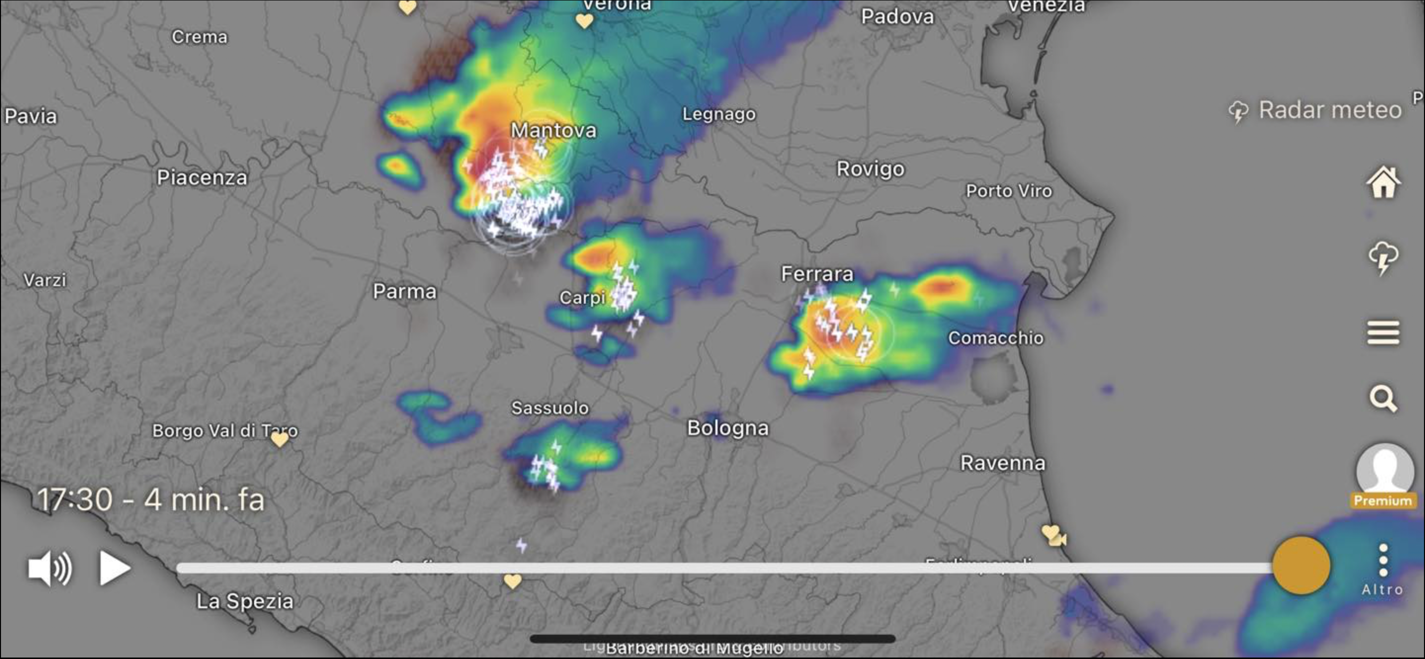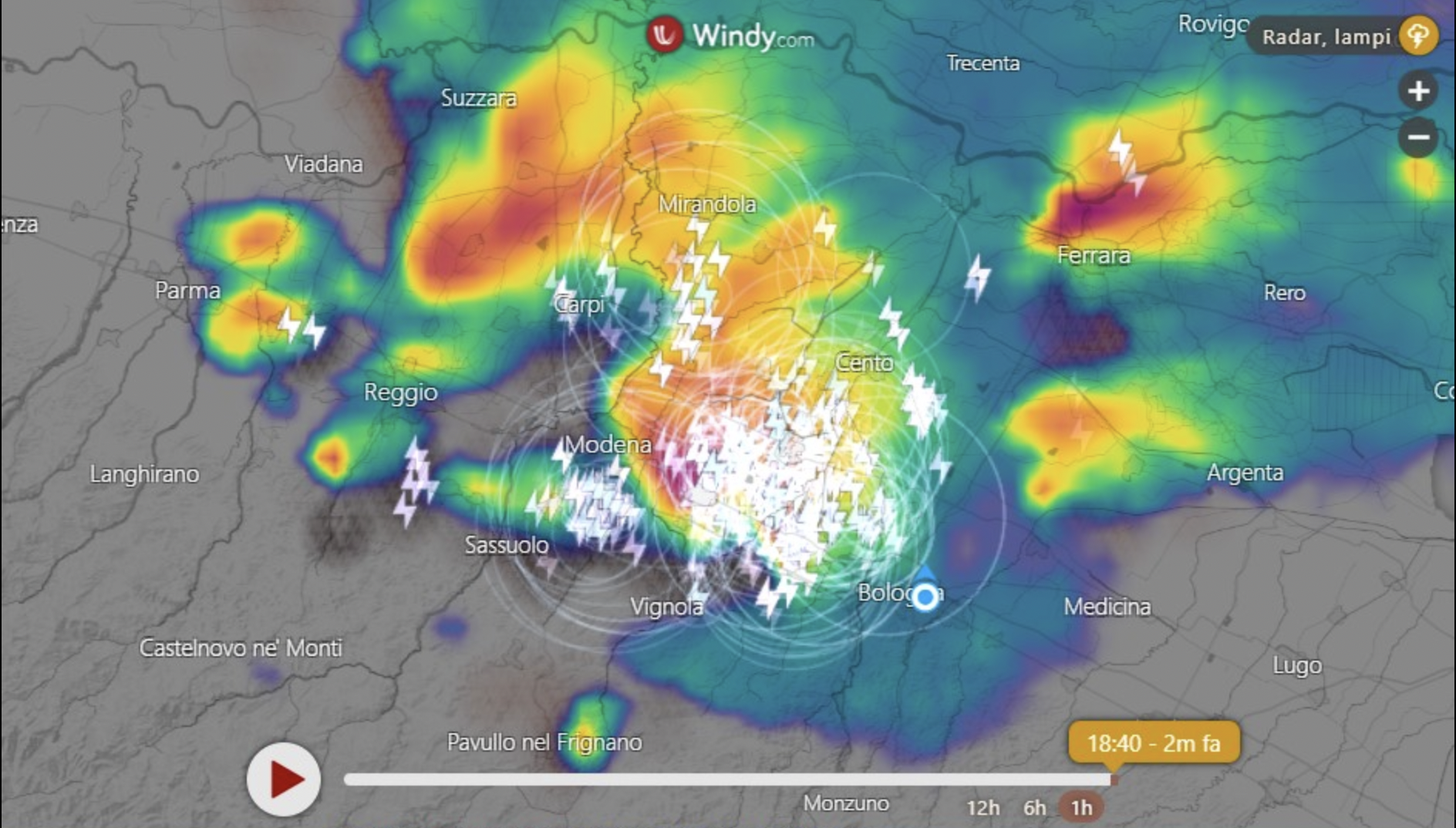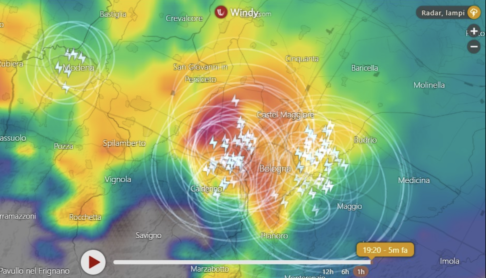 Dopo aver interessato il bolognese, il forte temporale ha rapidamente perso energia complice, soprattutto, una vivace ventilazione da Sud-Est lungo la costa e nell’immediato entroterra che ha interrotto l’avanzata di questi temporali dopo oltre 200km percorsi.