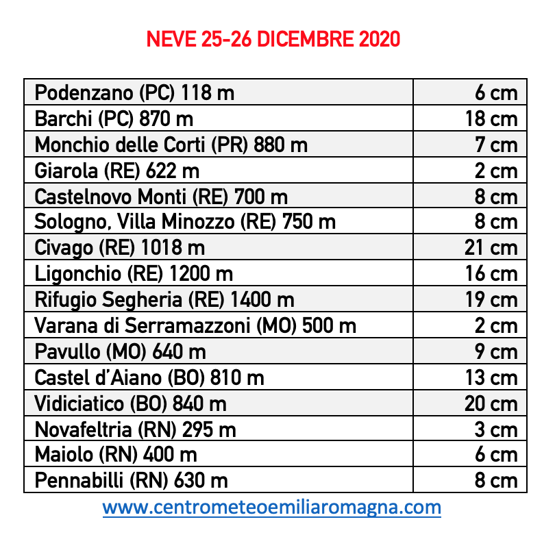 Terminiamo il report con gli accumuli registrati in alcune località regionali grazia al PROGETTO NEVE targato Centro Meteo Emilia Romagna