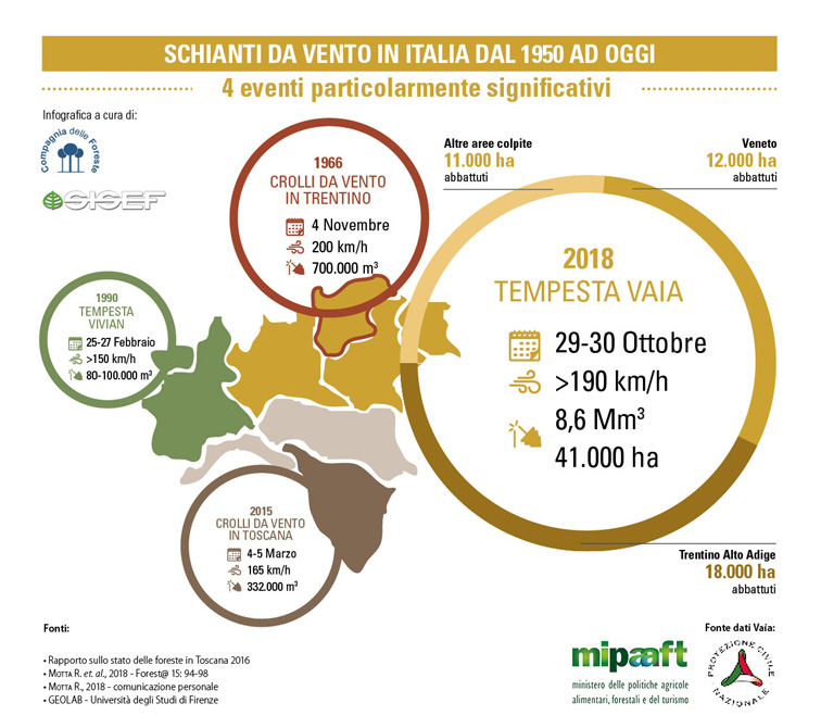Per quanto riguarda le foreste del nord-est, Vaia ha fatto raggiungere gli 8,6 milioni di metri cubi di alberi schiantati e circa 41.000 ettari di bosco abbattuto. Si tratta senza dubbio dell’evento più gravoso sul nostro territorio, superiore anche a quello del novembre 1966. Su quest’ultimo può risultare una sottostima dei volumi abbattuti, anche per via del fatto che le valutazioni erano condotte in maniera diversa e meno raffinata al tempo, tuttavia si considera ampio il margine tra i due eventi.