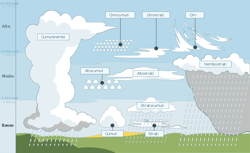 - NUBI BASSE, si formano fra il suolo e 2000 metri, sono costituite da una base ben definita ed internamente da gocce d’acqua in sospensione. Generalmente da esse dipende la maggior parte delle precipitazioni. Si distinguono in cumuli e stratocumuli.