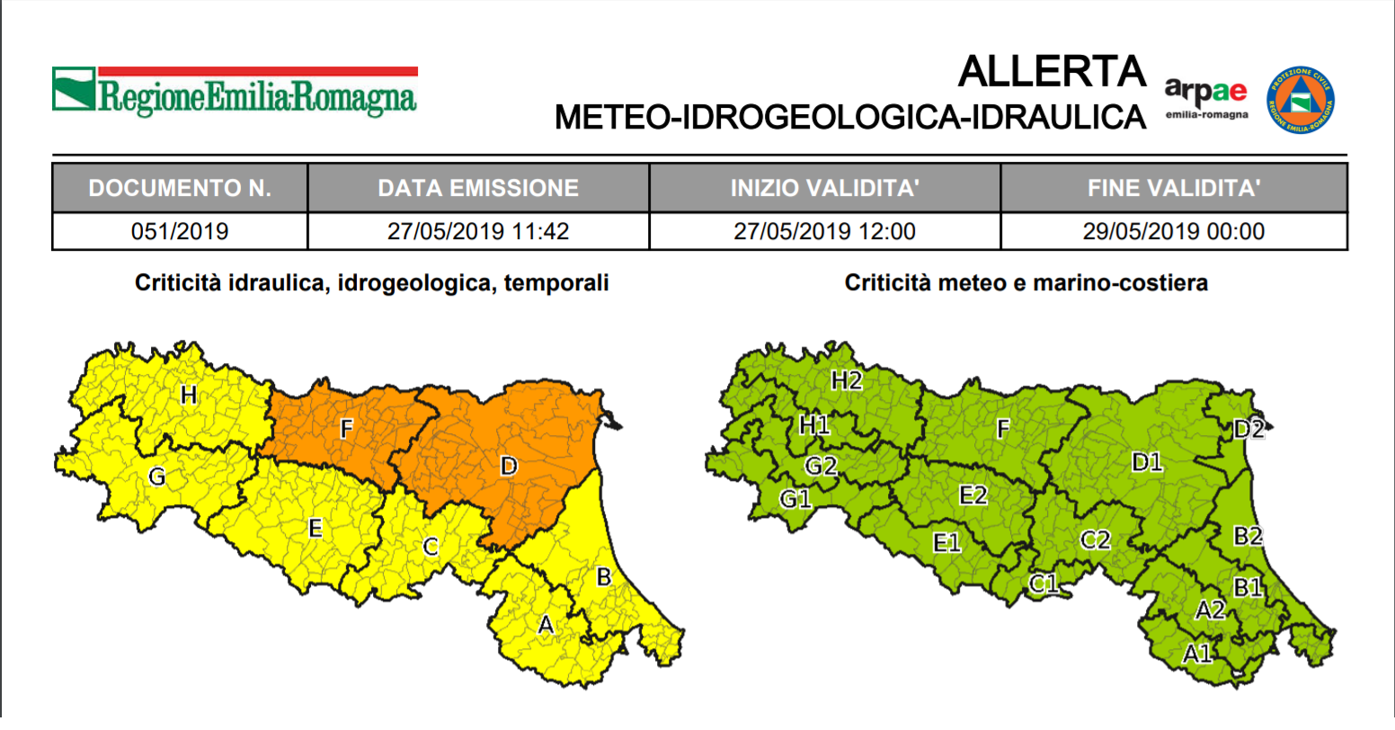La Protezione Civile ha emesso un’allerta valida dalle ore 12.00 odierne fino alle ore 00:00 di Mercoledì 29 Maggio per piene dei fiumi, dei corsi minori e frane.