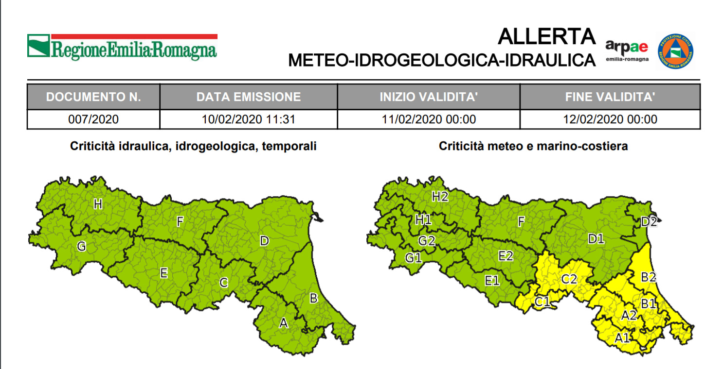 Zone interessate dall’allerta: A1 – Montagna Romagnola (FC-RN); A2 – Collina Romagnola (RA-FC-RN); B1 – Pianura Romagnola (RA-FC-RN); B2 – Costa Romagnola (RA-FCRN); C1 – Montagna Emiliana Orientale (BO); C2 – Collina Emiliana Orientale (BO-RA);