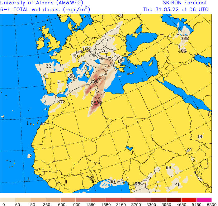 Le mappe sottostanti mostrano appunto le concentrazioni di sabbia in sospensione(fig.1) e del deposito umido(fig.2): infatti dove pioverà precipiteranno al suolo (dunque su auto e infrastrutture) alte concentrazioni di pulviscolo sahariano dunque sconsigliamo di lavare auto e mezzi di trasporto.