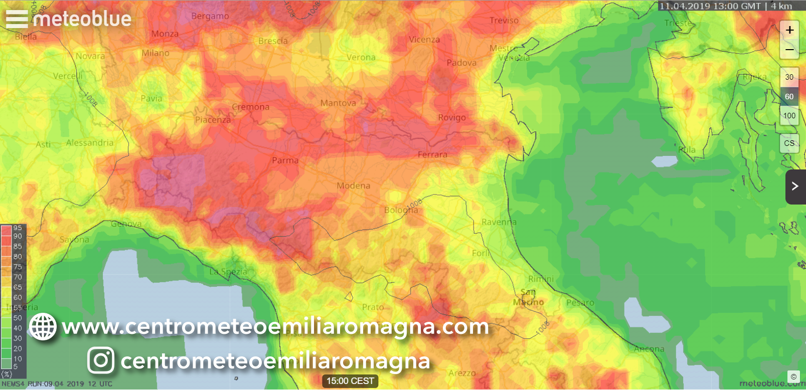 La probabilità di precipitazioni sarà in netto aumento dal pomeriggio, elevata sulla pianura emiliana(maggiore del 75%), medio-alta altrove ad eccezione del settore costiero.