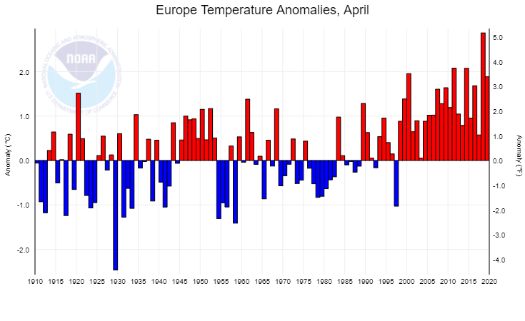 Analizzando nel dettaglio il nostro continente, Aprile 2019 si classifica come il 5° più caldo di sempre, mentre il primato rimane all’Aprile 2018. Osservando il grafico, possiamo notare come il trend europeo per il mese di Aprile sia quello di una netta prevalenza di temperature sopra la media negli ultimi 15/20 anni.
