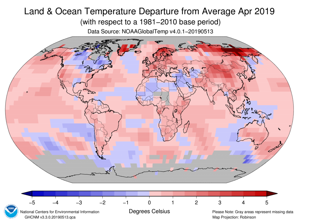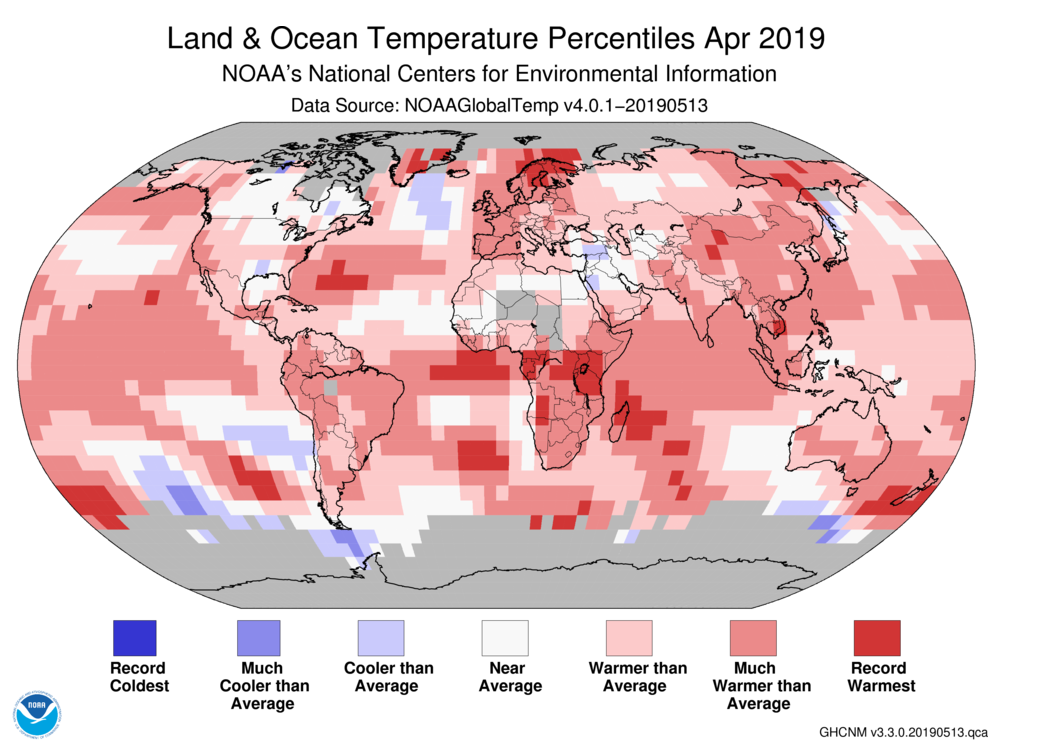 A livello globale Aprile 2019 risulta il secondo più caldo di sempre da quando si effettuano le rilevazioni, vediamo nel dettaglio i dati NOAA.