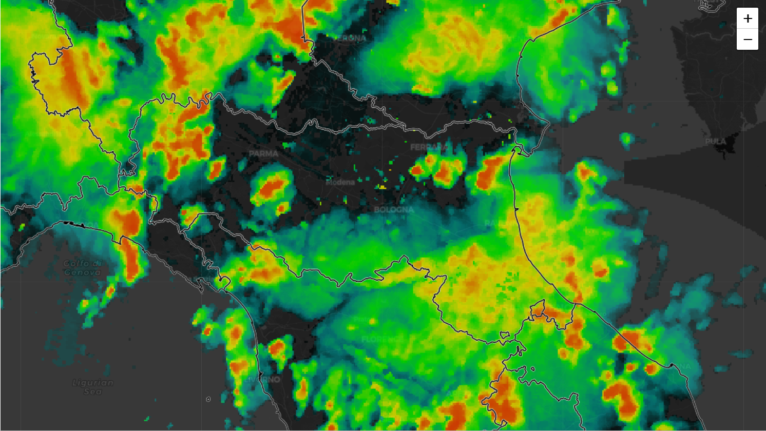 Situazione attuale che vede rovesci moderati, o localmente più intensi su Romagna ed Emilia orientale, mentre il settore occidentale, tra Piacentino e Parmense, vede fenomeni più severi.