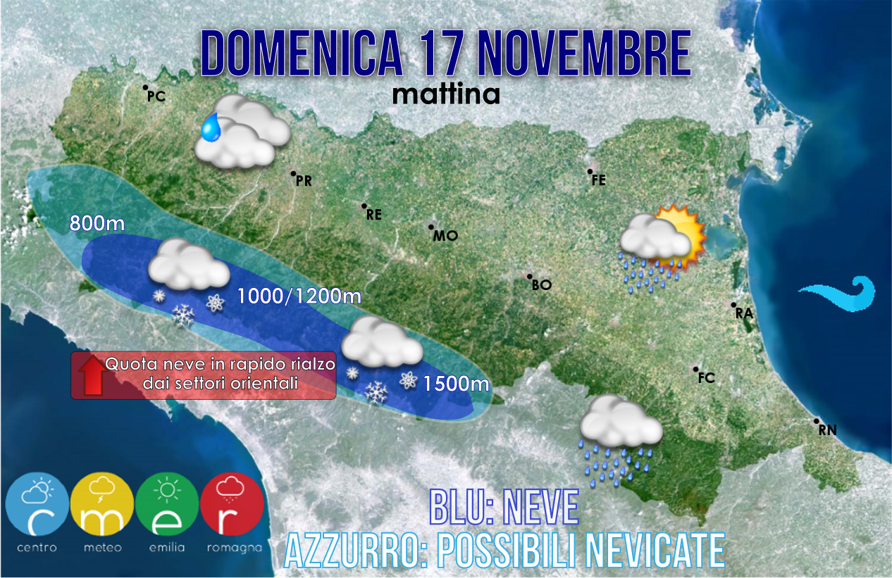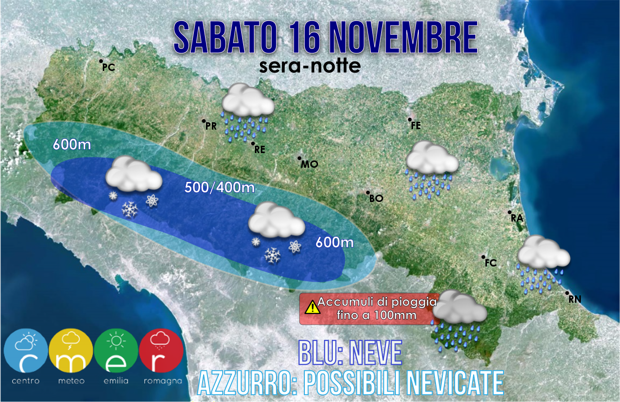 Situazione diversa per l’Appennino Romagnolo, che vede le probabilità più elevate di neve tra il tardo pomeriggio e la prima parte di serata odierna, Sabato 16 Novembre. Difatti, tra tarda serata e notte, il richiamo mite di Scirocco favorirà un rialzo termico con pioggia tra il moderato e il forte a tutte le quote. Precipitazioni nevose invece possibili tra le ore tardo pomeridiane e quelle di prima serata sui 1300 m per quanto riguarda l’Appennino Forlivese e sui 1500/1600 m per quanto riguarda il Riminese. Tra notte e mattina piogge anche abbondanti con accumuli fin sui 100 mm.
