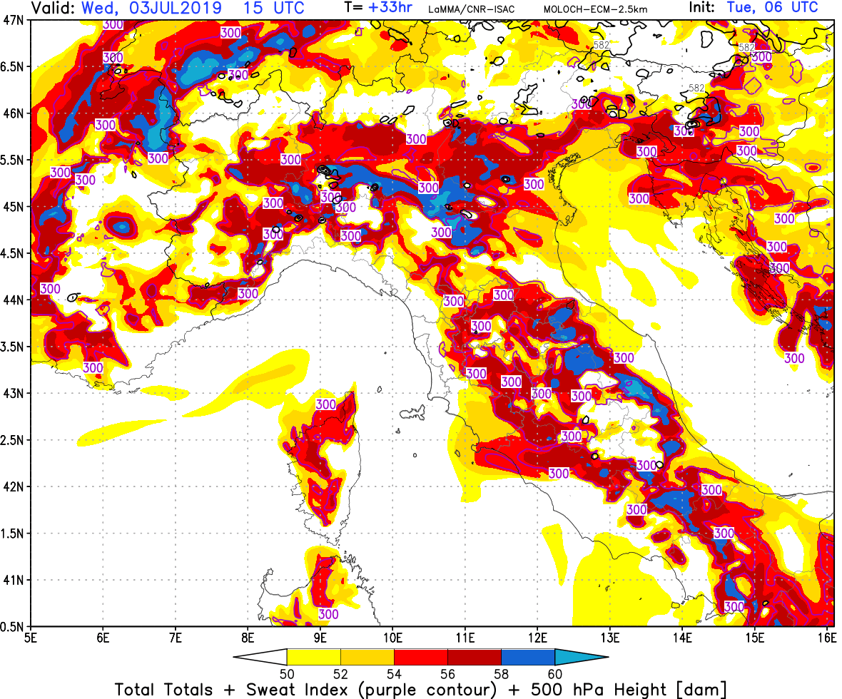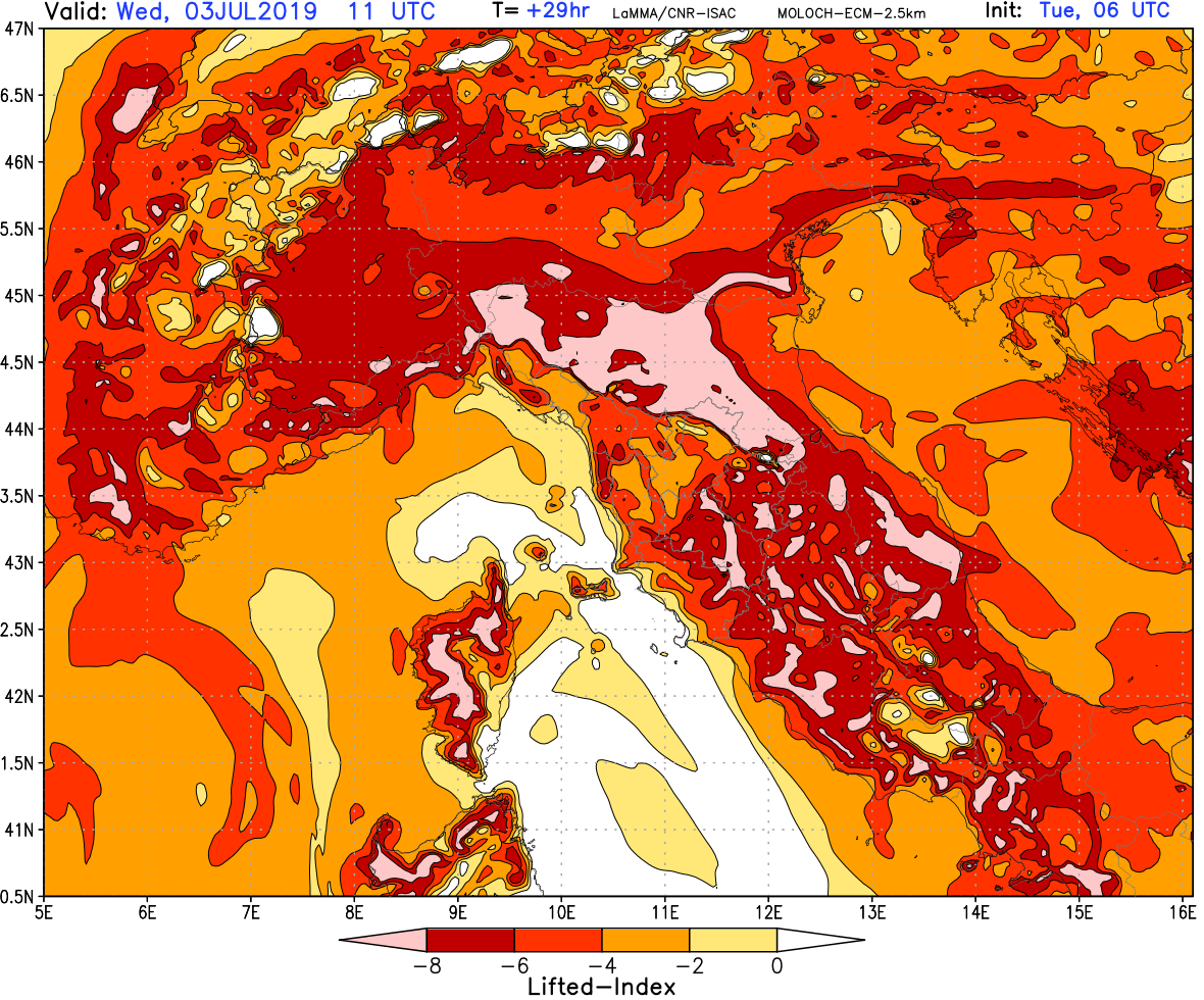 Valori di CAPE elevati sulla pianura, anche superiori a 3000 J/Kg suggeriscono la presenza di molta energia disponibile per la convezione. I successivi due indici, Lifted Index e Total Totals, indicano appunto l’elevata probabilità di fenomeni intensi, nonché eventualmente grandinigeni e in questo caso anche di medie dimensioni.