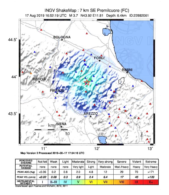 La seconda mappa mostra l’intensità di scuotimento, estesa a gran parte della provincia di Forlì-Cesena, dove difatti è stata avvertita distintamente la scossa.