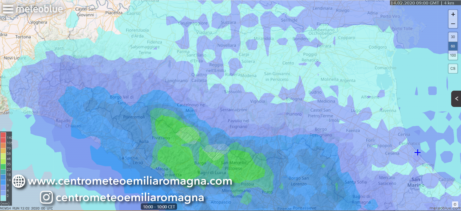 Sul crinale situazione differente, saranno possibili cumulate circoscritte sui 25-40 mm di pioggia. Neve che riguarderà in prevalenza solo le vette, con quota in rialzo nel corso delle ore serali dai 1300 m ai 1700 m.