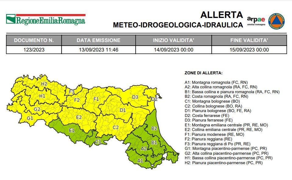 Per giovedì 14 settembre è stata emessa l’allerta meteo n.123/2023 valida sul territorio regionale dell’Emilia-Romagna per temporali. Per giovedì 14...